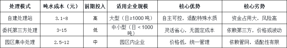 污水處理模式主要分為自建處理站、委托第三方處理、園區(qū)集中處理三類,不同模式的成本結(jié)構(gòu)、適用場景差異顯著,選擇時需結(jié)合自身需求綜合評估。