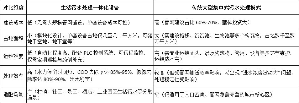 相較于傳統(tǒng)污水處理模式,生活污水處理一體化設(shè)備在技術(shù)、經(jīng)濟(jì)、運(yùn)維等多維度均展現(xiàn)出顯著優(yōu)勢,完美適配分散場景的治理需求: