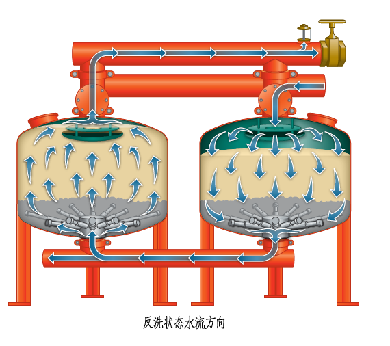 隨著雜質(zhì)在填料層中不斷聚積,內(nèi)部壓頭損失將不斷增大。當(dāng)進(jìn)、出水壓頭損失達(dá)到預(yù)定值時(shí),系統(tǒng)將自動(dòng)激活定壓裝置使其轉(zhuǎn)換至反洗狀態(tài),當(dāng)此臺(tái)反洗結(jié)束,水力閥改變給水方向從而實(shí)現(xiàn)逐臺(tái)反洗,更便于清洗聚積起來(lái)的雜質(zhì)。